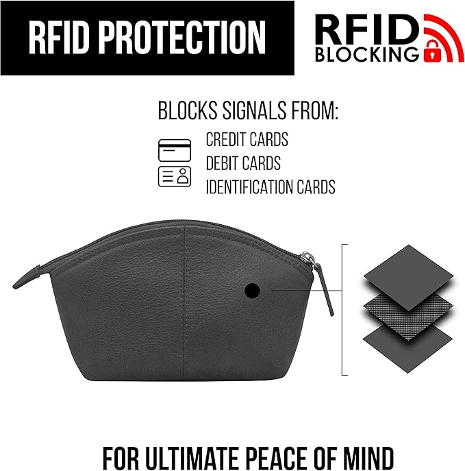 - Secure Protection: Made with a RFID blocking lining, this small leather pouch keeps your cards and information safe. The top zip closure and interior pocket ensure secure storage, keeping your items organized and protected
