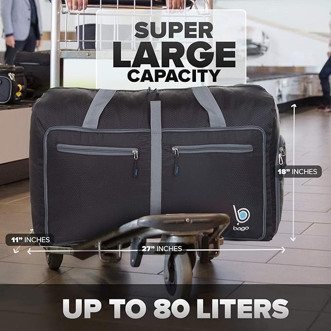 Bago Large Foldable Duffel Bags for Traveling Women & Men - 80L Packable Duffle Bag for Travel with Shoe Compartment - Water Repellant, Heavy Duty, Lightweight Folding & Collapsible (Black)