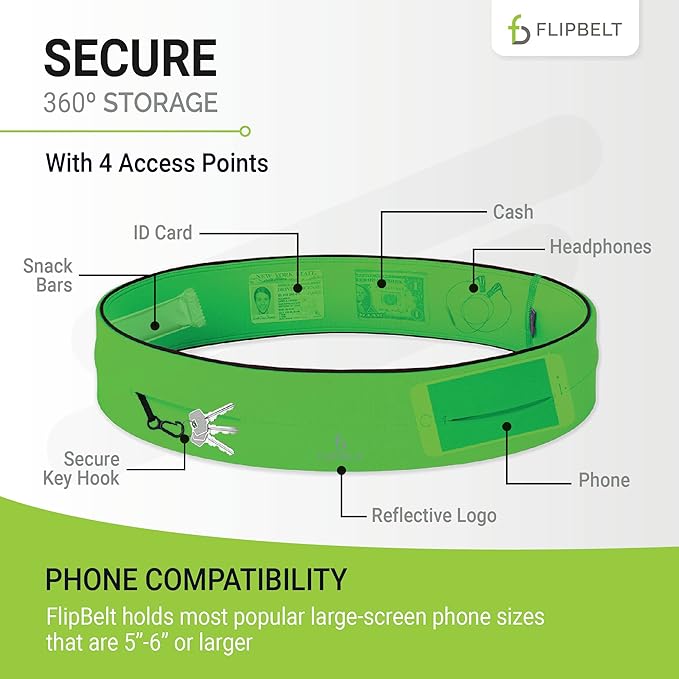 - MONEY & PHONE POUCH: The FlipBelt features 4 pocket openings to slip in all your must-have items, like cards, cash, and earphones, and it even has an internal key hook for added security. Itβs bounce-free storage for your phone during your workout and is compatible with screens 5"β6" and larger.