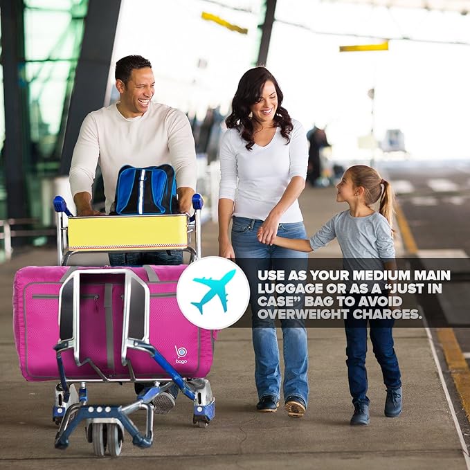 Bago Foldable Duffel Bags for Traveling Women & Men - 60L Medium Packable Duffle Bag for Travel with Shoe Compartment - Water Repellant, Heavy Duty, Lightweight Folding & Collapsible (Pink)