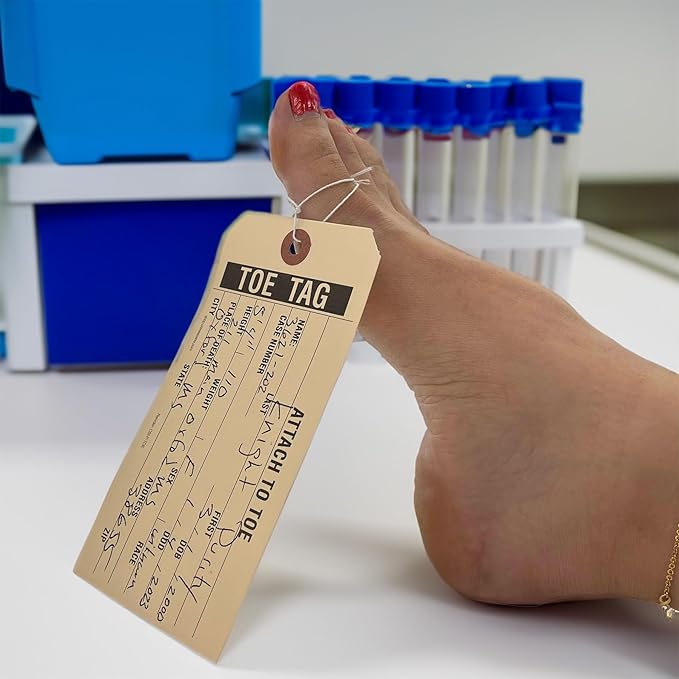 - Toe tags are used for identification purposes, typically containing the person's name, date of death, and other identifying information such as their age, sex, and height.