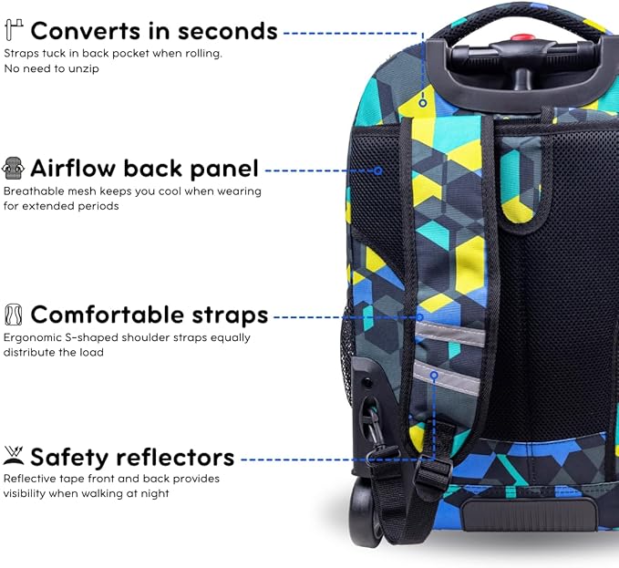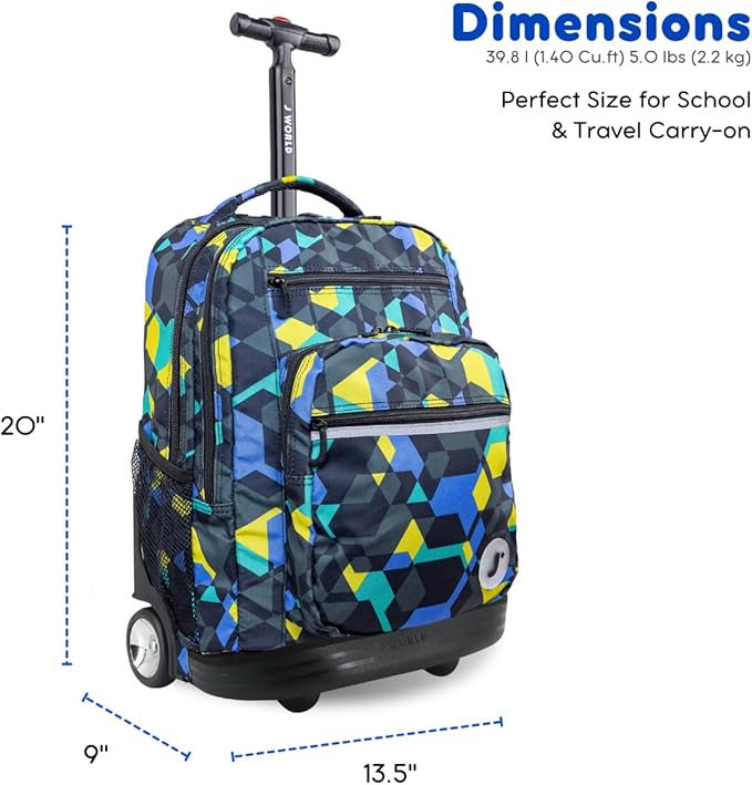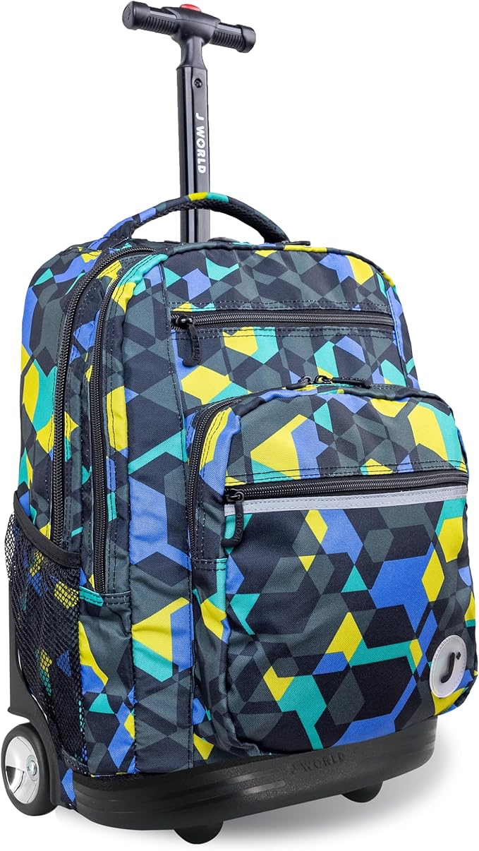 J World Sundance Laptop Rolling Backpack for Girls Boys. Roller Bookbag with Wheels, Cubes