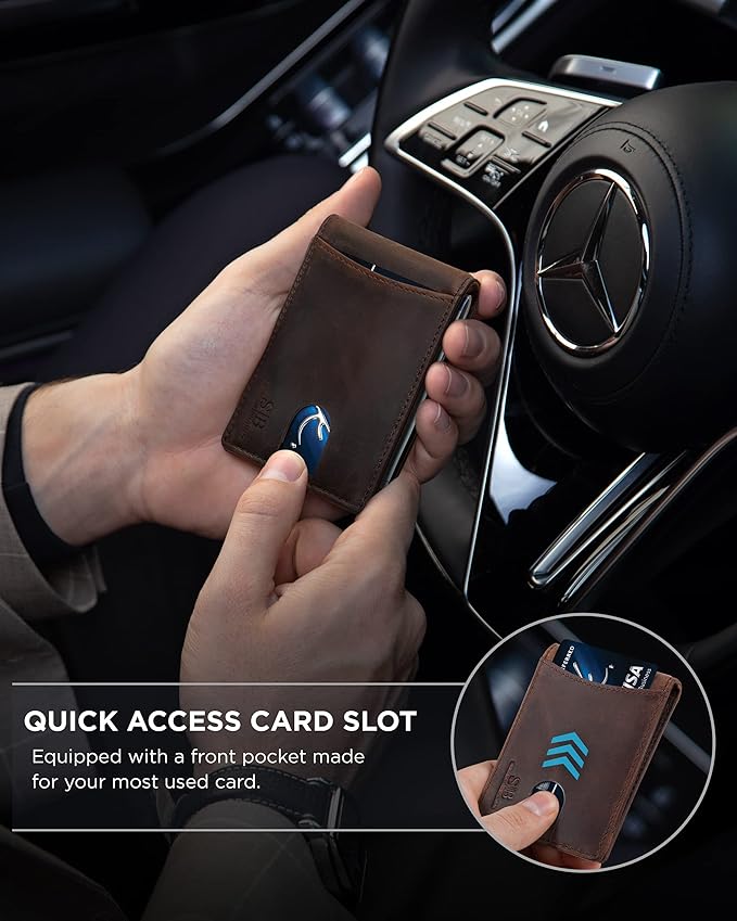 • SLIM AND STYLISH - Made with the Finest Full Grain leather, Top Grain Leather and Vegan Leather. Designed Quick Access ID Windows, Best Fits 6-8 cards plus US bills with no bulk, and a minimal Pull-tab design to reduce bulk - Wallet Size: 3.9" in. x 2.85" in. 0.5" in.