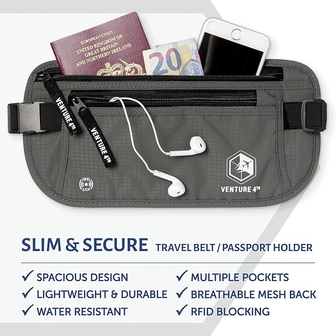 VENTURE 4TH Travel Money Belt - Slim Passport Holder RFID Blocking Travel Pouch to Protect Cash, Credit Cards and Travel Documents (Gray)