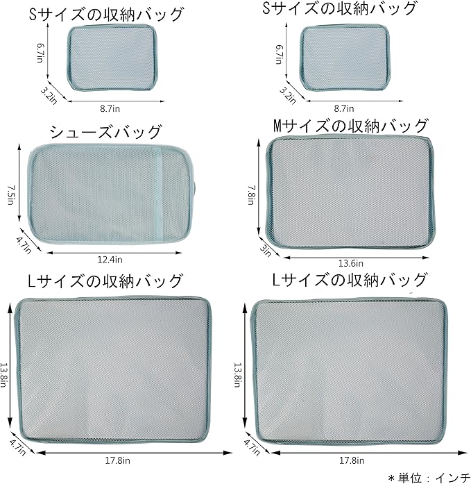 • SIZE: Large/19*13.8*4.7 inches;Medium/13.6*7.8*3 inches;Small/8.7*6.7*3.2 inches;Shoe Bag/12.4*7.5*4.7 inches. WEIGHT:340g. FIT 24/25 inch suitcase. ALL packing bags can be stored into the smallest packing cube when not in use.