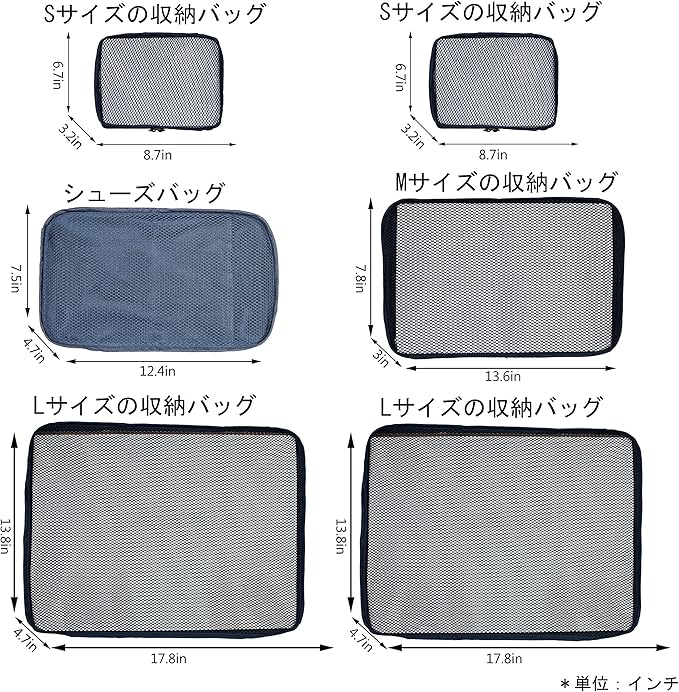 - SIZE: Large/19*13.8*4.7 inches;Medium/13.6*7.8*3 inches;Small/8.7*6.7*3.2 inches;Shoe Bag/12.4*7.5*4.7 inches. WEIGHT:340g. FIT 24/25 inch suitcase. ALL packing bags can be stored into the smallest packing cube when not in use.