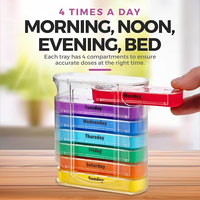 - REMARKABLE DESIGN: The cutting-edge dispenser is constructed to hold seven trays separately. Each tray is dedicated for one weekday and has four compartments with morning, noon, evening and night label.