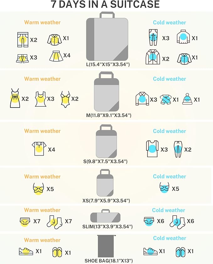 - Set Includes: 1*Large (39x38x9 cm /15.4x15x3.54 inches), 1*Medium (30x23x9 cm /11.8x9.1x3.54 inches), 1*Small (25x19x9 cm /9.8x7.5x3.54 inches) , 1*Smallest (20x15x9 cm /7.9x5.9x3.54 inches), 1*Slim (33x10x9 cm /13x3.9x3.54 inches), and 1*Laundry bag (46x33 cm/18.1x13 inches)