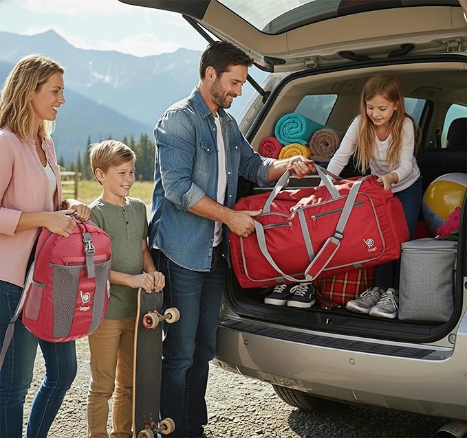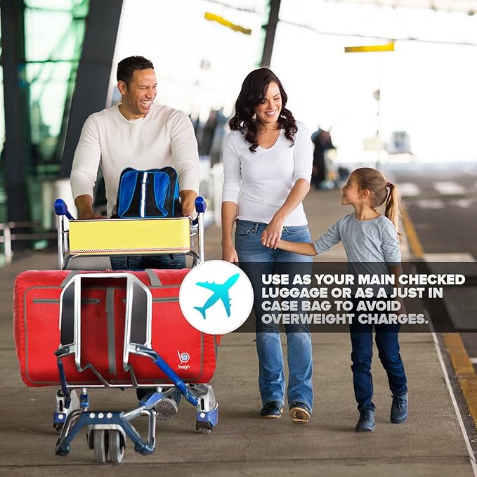 Bago Large Foldable Duffel Bags for Traveling Women & Men - 80L Packable Duffle Bag for Travel with Shoe Compartment - Water Repellant, Heavy Duty, Lightweight Folding & Collapsible (Red)