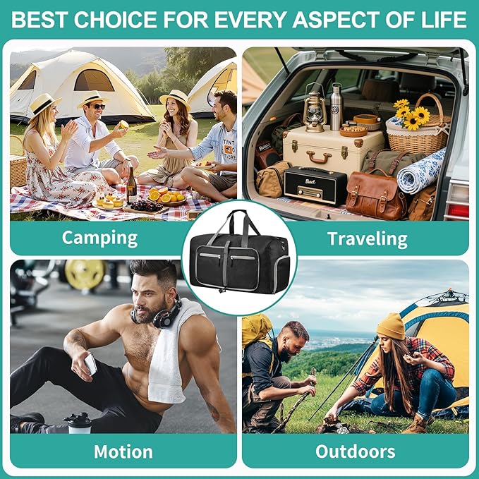 - Foldable and Spacious travel bag: The foldable duffle bag for travel can be folded into a really small size taking up so little space but opens up to have about 115L capacity of travel duffel bags to use as the luggage bag in case that your suitcase swells, this travel bag works very well when used in combination with a luggage, it's to give you an organized lightweight travel experience