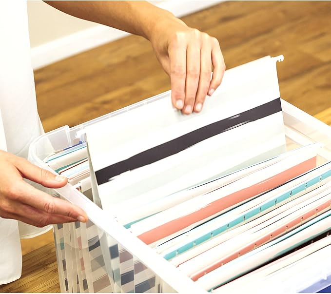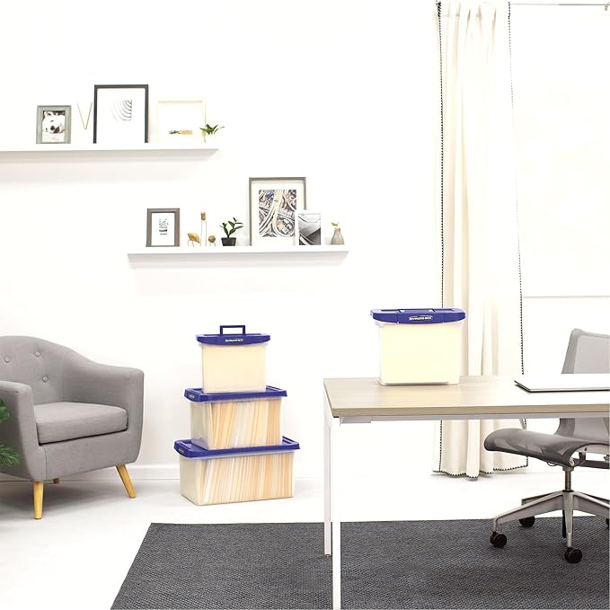 - Plastic file boxes with lids provide organized and secure storage and transport of letter and legal size files