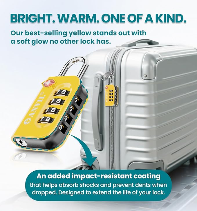 ANVIL TSA Approved Luggage Lock - 4 Digit Combination, 10,000 Combinations, Easy-Read Password Window, Travel Lock for Suitcases, Backpacks, Gym & Student Lockers, Baggage