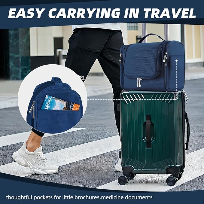 - Multiple Pockets and Compartments: The toiletry bag has more pockets and compartments than you might expect! It features 2 top mesh pockets ideal for small items like medicine and wet wipes. There is also a large main storage pocket for travel-size and normal-size toiletries, with internal compartments designed to keep liquid bottles upright. Additionally, the 2 side pockets are perfect for long, slim items such as makeup brushes, toothpaste, toothbrushes, and more