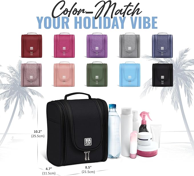- This travel toiletry bag has a unique design with 21 storage spaces. Its size of 8.5x4.7x10.2″ allows you to fit in all your items, while the metal hook makes it easy to hang anywhere.