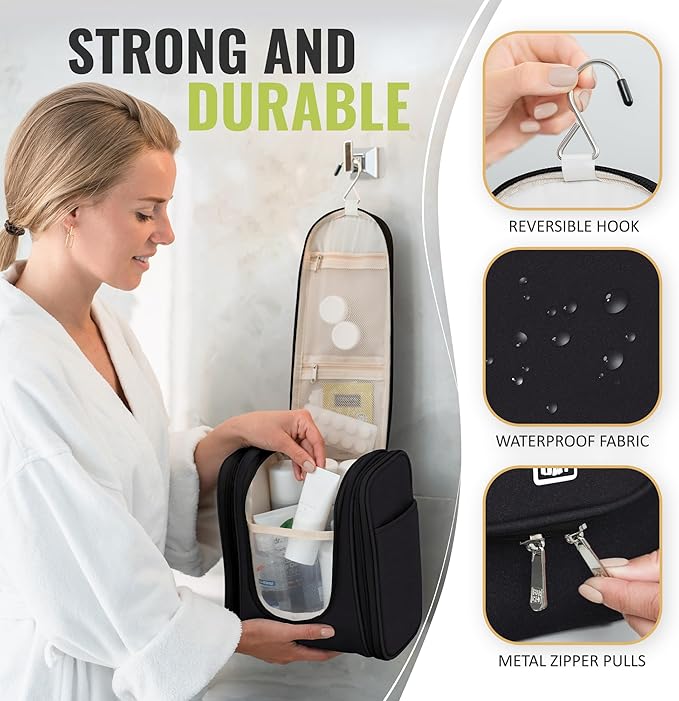 - Keep your travel essentials organized and safe with our sturdy hanging toiletry bag. It is waterproof, washing resistant, and features a foam layer for additional bottle protection.