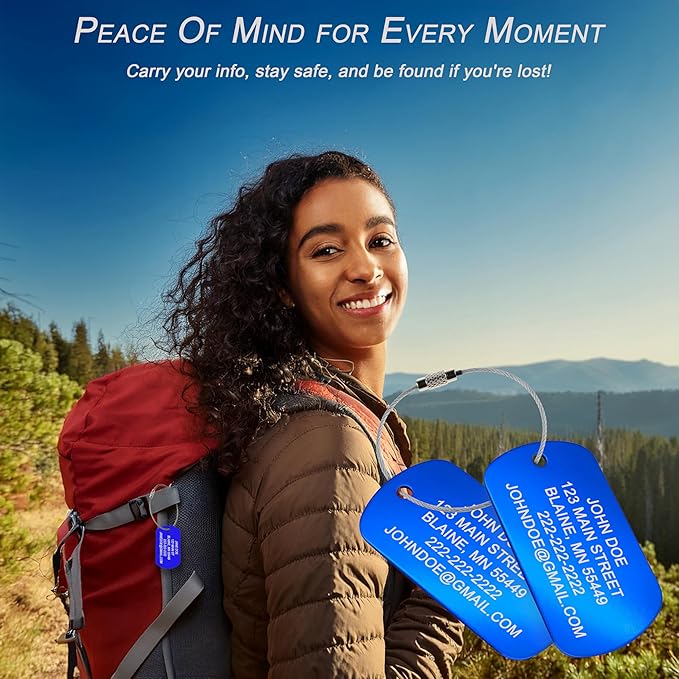 - Durable Construction: Made from impact-resistant anodized aluminum, these engraved luggage tags are built to endure rough handling and tough travel conditions. The anodized coating offers added protection against scratches, corrosion, and fading, keeping your ID tags vibrant, legible, and long-lasting.