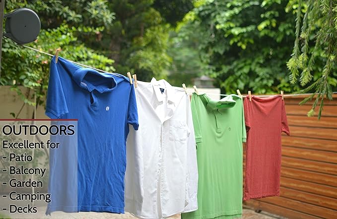 - Light And Compact – Lightweight Retractable Washing Line portable clothing line for your family. Now you can dry laundry indoors and outdoors. Excellent for Hotels, Patio, Balcony, Bathroom, Shower, Deck, Camping and more. Load up to 30 Lbs. Extendable up to 45 feet retractable hanging line.