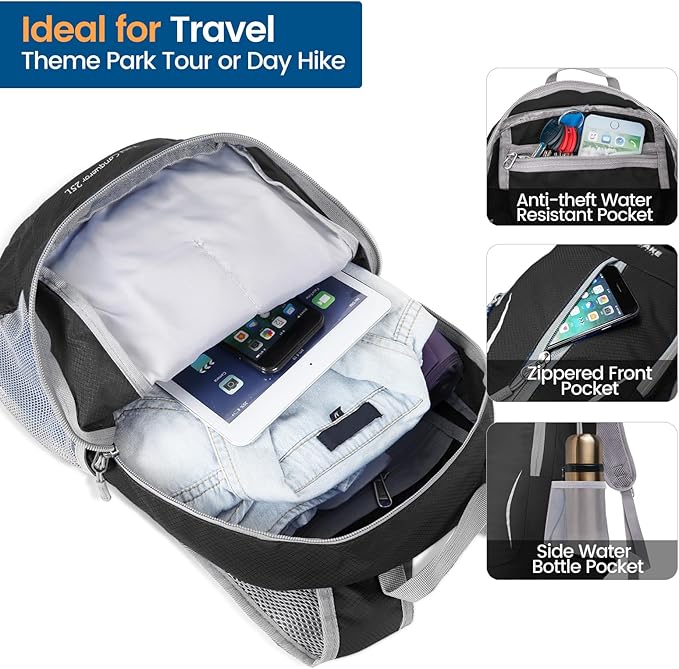 - Reasonable and Orderly: Our ultralight packable backpack capacity is 25L,and the pocket structure layout is reasonable and orderly.One main bag can accommodate sandwich lunch boxes and inner partitions to accommodate A4 paper size files;One inner bag can store important small items such as passports;2 front bags can store small booklets such as travel guidelines;2 side bags can store water bottles and umbrellas