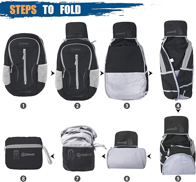 - High-Quality Materials: Our light foldable backpack is water resistance(note:not completely waterproof).We use high-tear nylon fabrics and use the latest double-layer wear-resistant process to reinforce the backpack suture.After high-quality materials and light foldable hiking backpacks produced by good craftsmanship,it can effectively protect the items in the backpack.The zipper made of two-way SBS metal and high-quality resin materials greatly reduces the trouble of being stuck in the zipper