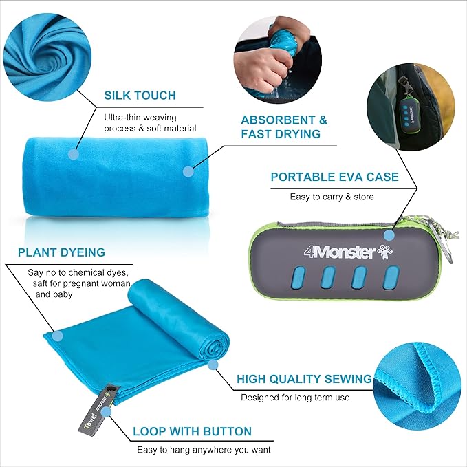 4Monster Camping Towel Super Absorbent-Quick Dry Microfiber Towel Ultra Compact & Soft-Travel Towel Lightweight for Backpacking,Hiking,Gym,Beach,Swimming,Yoga