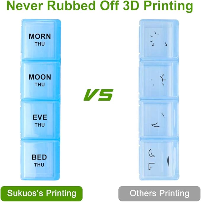 - No Need To Remember: 7-day pill organizer will track your pills 4 times a day (MORN NOON EVE BED), letter mark won't fade, and reminds you what to take by the day, you just need to fill our pill organizer once a week.