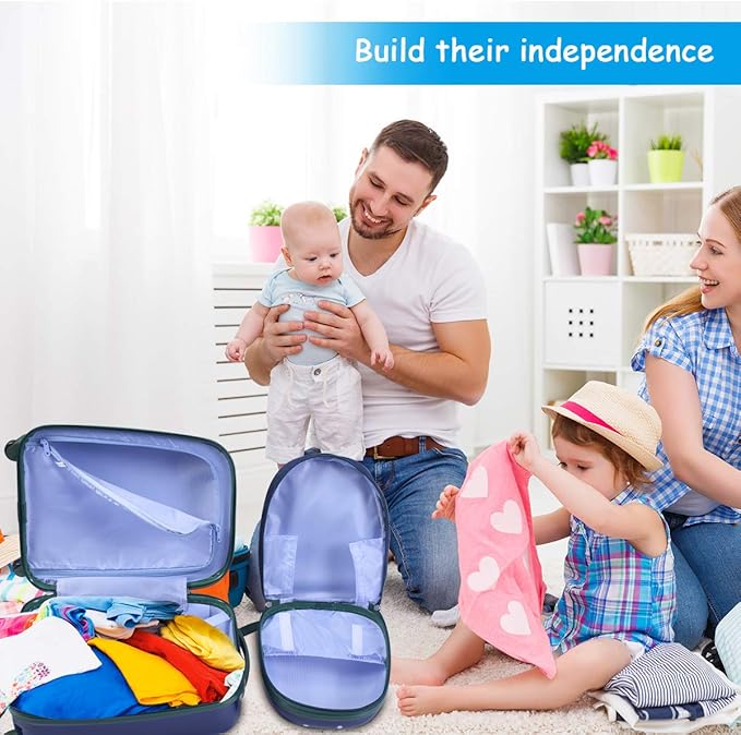 - 【Sturdy and Durable Construction】This kid's luggage set is made of premium ABS plastic with polycarbonate composite, which features high hardness and toughness, sturdy enough to last long time without damaged easily. Perfect size to be put in the overhead compartment of the plane or under the seat on an airplane.