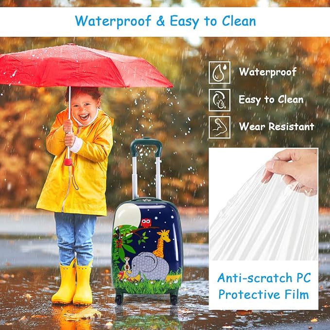 - 【Waterproof and Easy to Clean】This kids luggage set has a waterproof and scratch-resistant protective film on the surface, which is durable and can be used even in rainy weather. It’s more suggested that you can wait until it starts to peel off the layer over the graphic after 2-3 times use. If your suitcase or bag is dirty, just wipe it off with a damp cloth.
