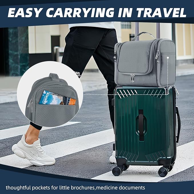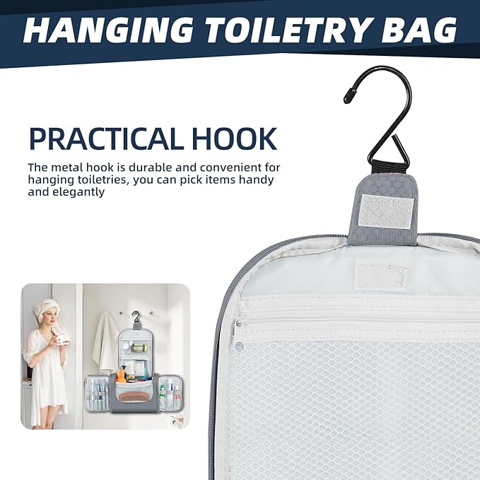 - Practical Hanging Hook: Our hanging toiletry bag features the HANGING function, the metal hook helps you hang the whole bag on the wall, especially in a narrow bathroom, camping tent, or RV. The hanging toiletry bag would save space and be convenient for accessing items while bathing