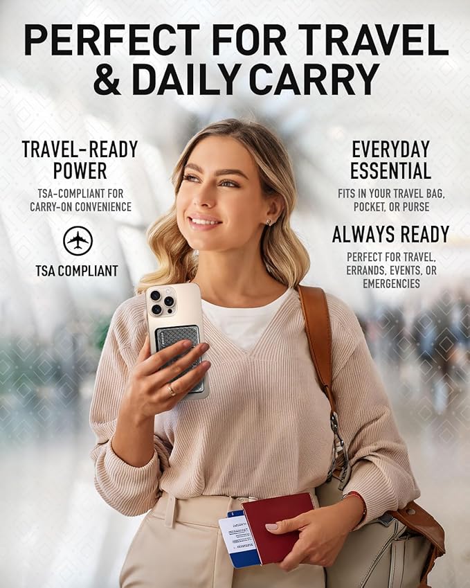 - [Travel-Friendly and TSA-Compliant Design] – A Magsafe-compatible battery pack crafted to go anywhere with you. Slim and secure enough for carry-on items, perfect for flights and daily travel.