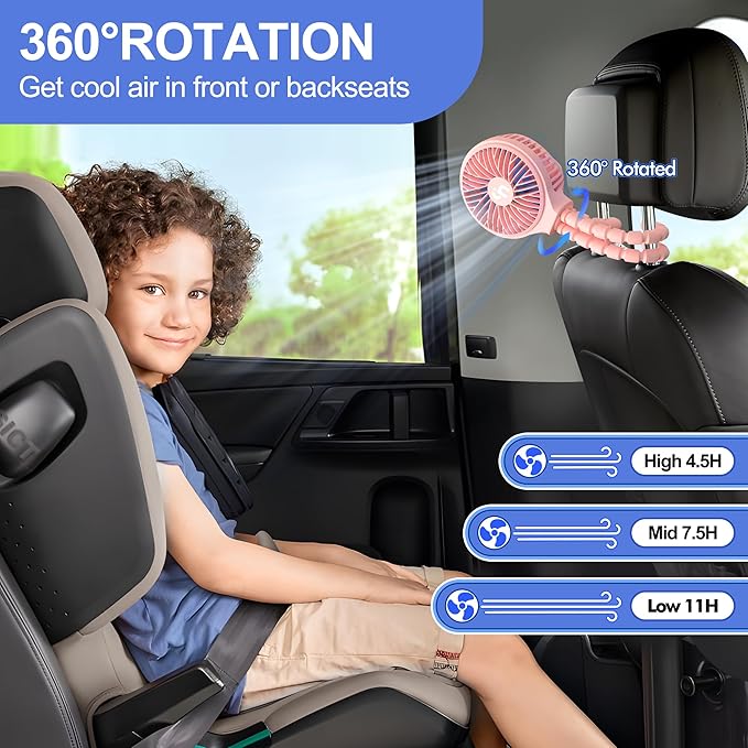 - 【360°Rotating Head】 This car seat fan head can be horizontally adjusted in any direction. It has three wind speed settings that can be adjusted according to the weather temperature, you can find a wind speed and angle that is suitable for babies to make them feel more comfortable.