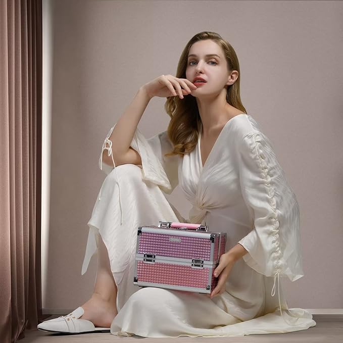 - Mermaid Pink Makeup Box: Makeup box measures 9.44 x 6.69 x 7 inches, making it an ideal size for travel. Made from high-quality materials, it combines sturdy ABS aluminum with metal-reinforced corners for excellent durability. Despite its strong construction, the box is lightweight and easy to carry. Its waterproof, glittery pink surface not only looks stylish and eye-catching but also protects your makeup from moisture and other outdoor elements. The unique color subtly changes and reflects light from different angles, adding both beauty and practicality.