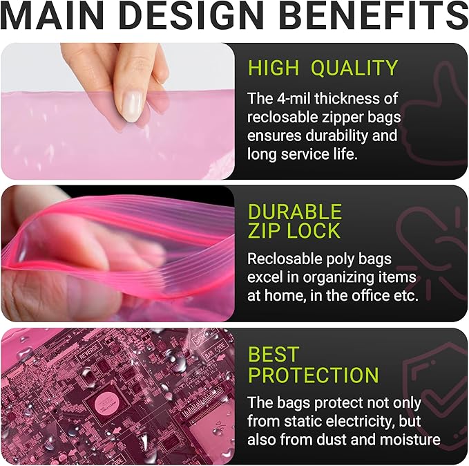- Affordable Solution. Pink anti-static bags are excellent for protecting sensitive electronic components that require frequent access. These anti static plastic bags safeguard electronics, computer parts, and film.