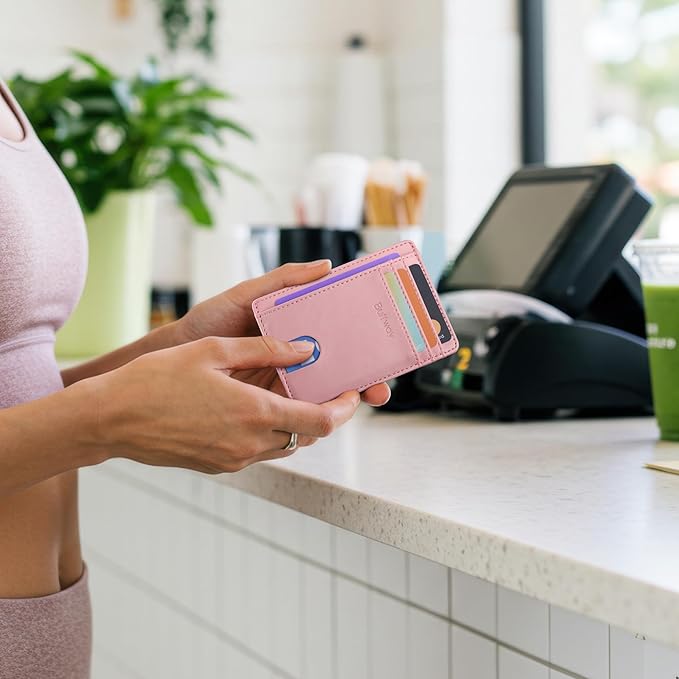 Buffway Slim Minimalist Front Pocket RFID Blocking Leather Wallets for Men and Women - Alaska Pink