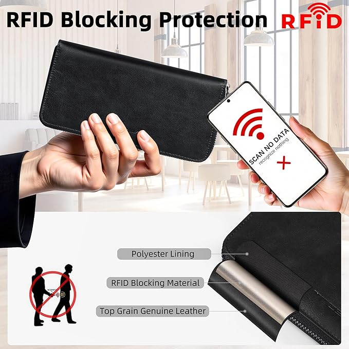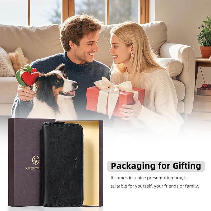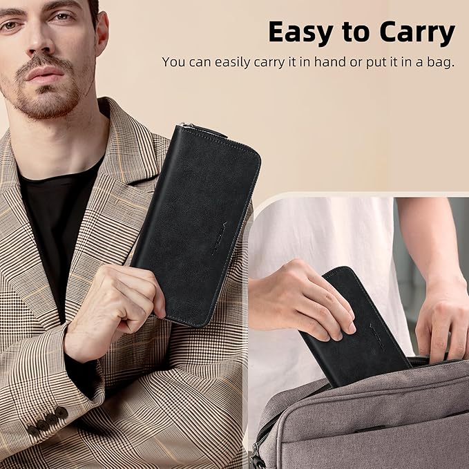 VISOUL Leather Long Zipper Pouch Wallet for Men and Women with RFID Blocking, Large Clutch Cash Long Wallet with Zipper (Black)