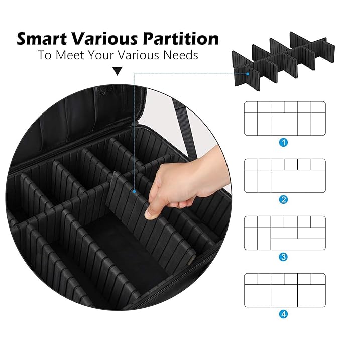 - Spacious & Customizable: This 13.58 x 9.25 x 4.13-inch makeup case offers ample space to store full-sized eyeshadow palettes, makeup brushes, and other cosmetics. With 10 adjustable partitions, you can customize the compartments to fit your specific needs.