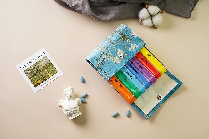 Pill Organizer Pill Box,LIZIMANDU Weekly Travel Pill Case Box Medication Reminder Daily AM PM,Day Night 7 Compartments,for 4 Times A Day,7 Days a Week-Includes Leather Carrying Case(Peach Blossom Set)
