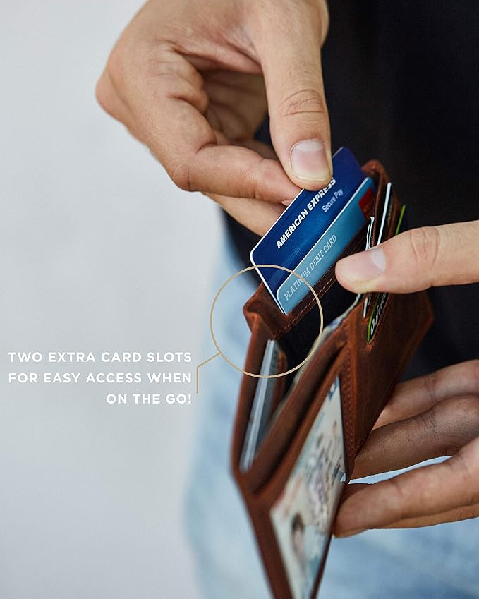 - PREMIUM LEATHERS- Our vintage leathers stay true to their nature by being receptive to scratches. With use, the bifold wallet will absorb the natural oils from your hands and will develop a rich and dark color. Over time, your wallet will develop a character that matches your adventures.