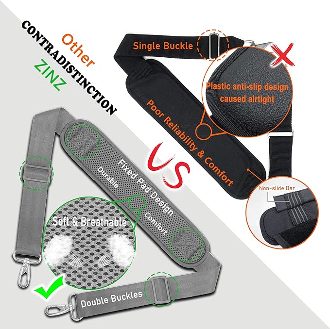 - 1. ABOUT ZINZ BAG SHOULDER STRAP: ZINZ universal bag strap replacement can replace all broken straps of ANY BAG WITH D-RINGS OR EQUIVALENT HARDWARE. Especially for shoulder bag / laptop computer bag / briefcase / messenger bag / duffel bag / diaper bag / tool bag / guitar bag. Professional package, 24hrs after-sale service, 30-DAY MONEY-BACK for ZINZ Shoulder Strap