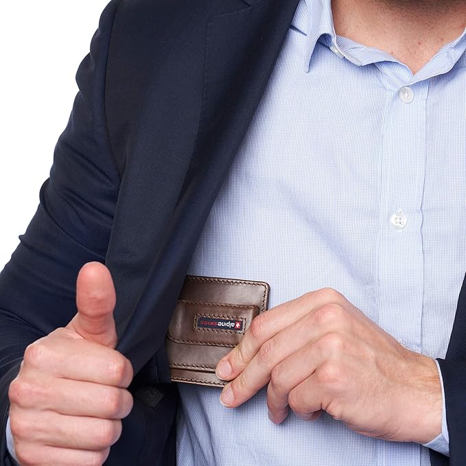 - GIFT BOXED & FRONT POCKET OPTIMIZED - Arrives in elegant Alpine Swiss gift box, perfect for birthdays, Father's Day, or any special occasion. Designed specifically for front pocket carry - provides enhanced security against pickpockets while eliminating the discomfort of sitting on a bulky back pocket wallet. Ideal for business professionals and travelers.