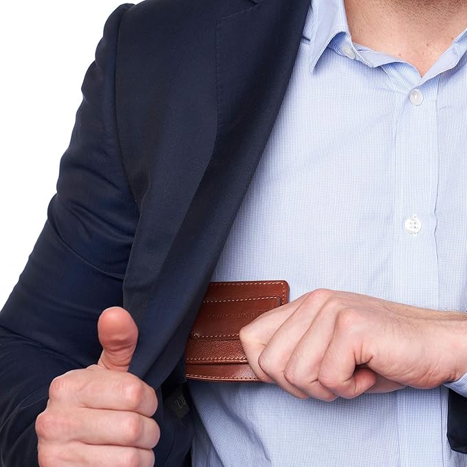 - SPRING-LOADED MONEY CLIP DESIGN: Non-magnetic spring tension clip securely holds 5–15 folded bills and maintains a strong grip over years of use. Compact front pocket wallet eliminates back pocket bulk discomfort. Crafted from genuine premium leather—not synthetic or bonded materials that often pose as real leather—it breaks in over weeks softening for easier card access molding to your pocket and developing a rich handsome patina with use For minimalists who value function over bulk