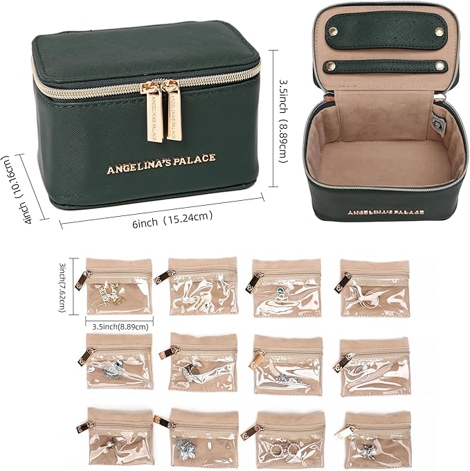 - STAY ORGANIZED--This case is designed with double metal zippers and pullers with "Angelina's Palace" logo engraved. The interior features one earring bar for 6 pairs of earrings and one ring bar for 6-9 rings behind the lid - perfect for storing your earrings and rings that are easy to access. A spacious main compartment with 12 see-through jewelry pouches that keep necklaces and bracelets separate and secure, while there is stilll plenty of space for watches and other essentials.