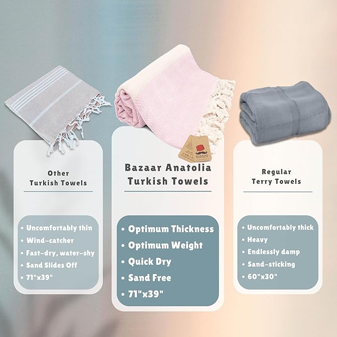 - Versatile: There are many ways to use Turkish Beach Towel. You can use the turkish towel as a scarf on the outside, shawl on the terminal, travel blanket on an airplane, oversized beach towel when you get off the plane and go to the beach. Quite useful as a travel beach towel. Or you can use as a bathroom towels, yoga mat towel, pool towel or a throw blanket in your house.