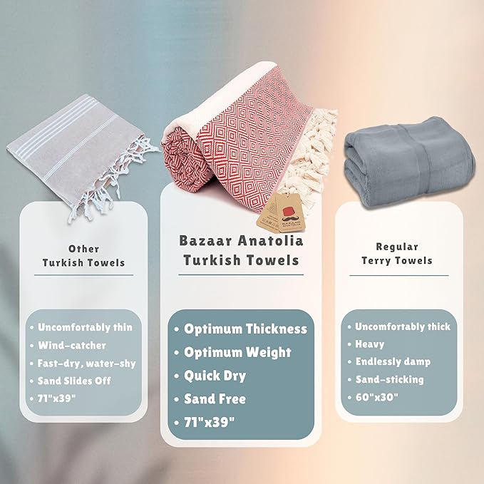 - Practical: Quick dry beach towels are oversized but super convenient to pack and carry. Say goodbye to heavy damp towels with sand on your bag. Sand free beach towel dries very quickly. Dries even when the sun is behind the cloud. Turkish towels are the best beach accessories for vacation must haves.