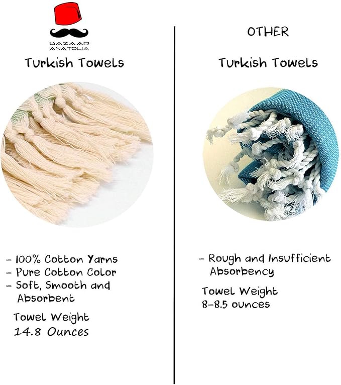 - High Quality: Each towel is carefully checked and packed by our teams. Turkish towels are soft and absorbent with 100% cotton yarns. Our towels becomes softer and absorbent after several washes. Also OEKO-TEX Certified yarns guarantees that our beach towels are free of harmful chemicals and perfectly safe for human use.