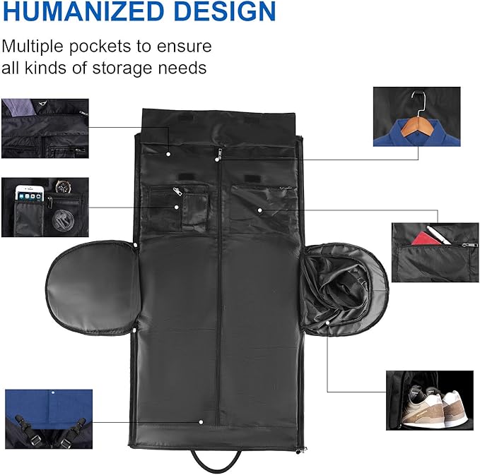 - ✅SUPER VERSATILE BAG: With the fancy design of combining the feature of garment bag and duffel bag, such as hanging clothes, various internal pockets (placed with tie, umbrella, wallet, mobile phone, etc.) and large capacity. On the side of the leather garment bag, there is a zip pocket for easy access to electronics or travel materials.