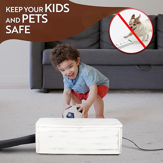 - DESIGNED WITH LITTLE ONES AND FURRY FRIENDS IN MIND: Featuring a magnetic lid and ventilation holes, this cord hider box power strip cover helps protect kids and pets