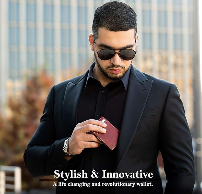 • Stylish & Practical - Functionality at its Best. A wallet that will meet your everyday needs and fits in your pocket without bulging. Two convenient outside card slots made for your most used cards, instantly have the cards you need to save time and energy. Photo ID slot located on the outside of the wallet, a smart solution to instantly access your ID. Innovative stainless steel money clip securely holds up to 15 bills, quick payments and organization made easy