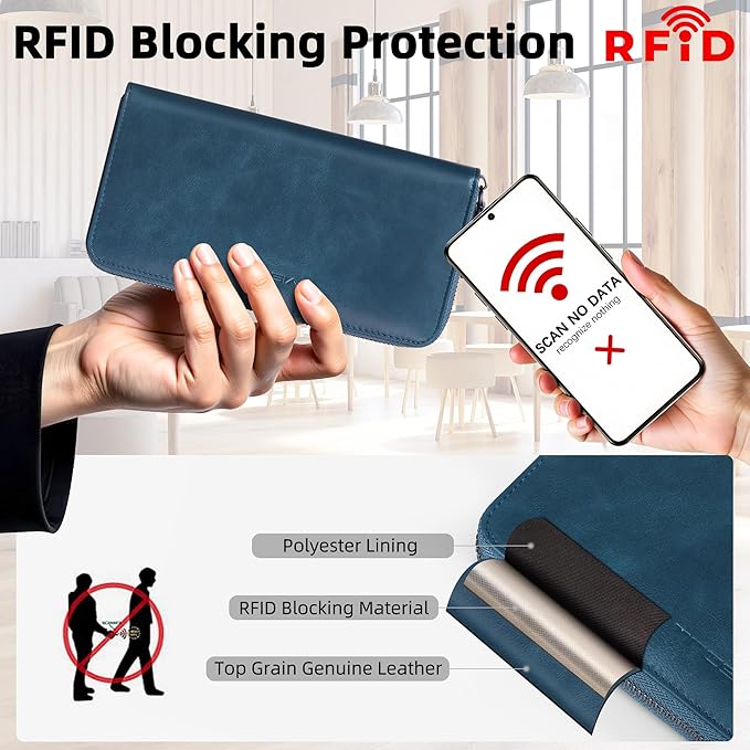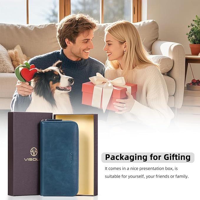 VISOUL Leather Long Zipper Pouch Wallet for Men and Women with RFID Blocking, Large Clutch Cash Long Wallet with Zipper (Navy Blue)