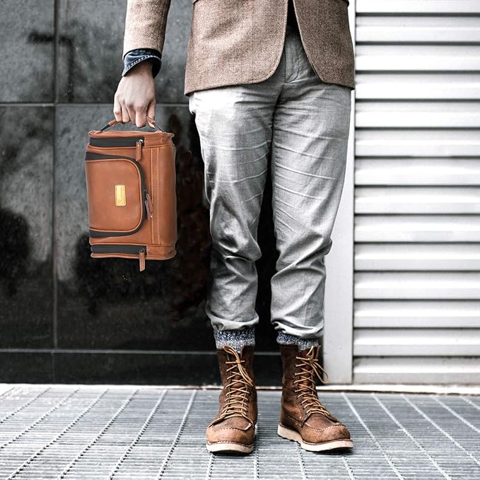 - Multiple Use -- With a built-in metal hook, it can hang on the door or other outdoor/indoor places. Thanks to the high quality durable material, this leather toiletry bag will maintain its shape even empty, so it can perfectly sit on the counter. Creative thickened carry handle design for your easy carrying while traveling or daily activities.