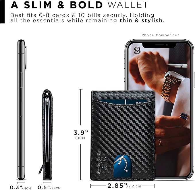 - SLIM AND STYLISH - Made with the Finest Full Grain leather, Top Grain Leather and Vegan Leather. Designed Quick Access ID Windows, Best Fits 6-8 cards plus US bills with no bulk, and a minimal Pull-tab design to reduce bulk - Wallet Size: 3.9" in. x 2.85" in. 0.5" in.